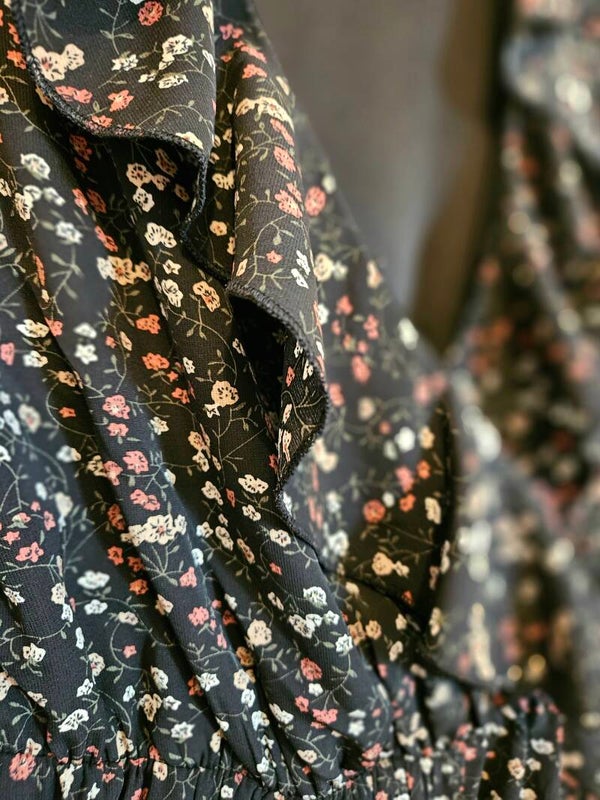 Robe fleurie manches 3/4, décolleté à volants
